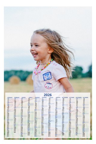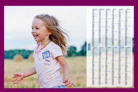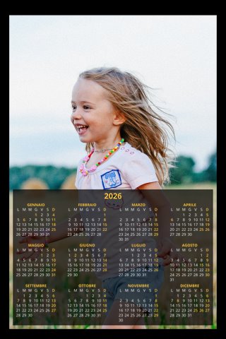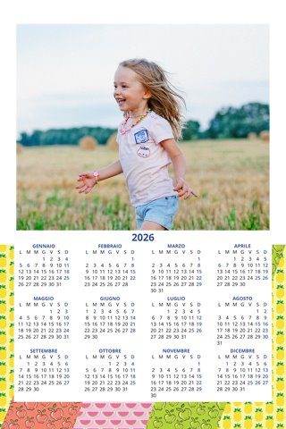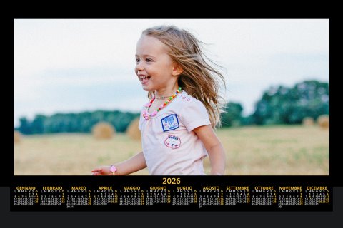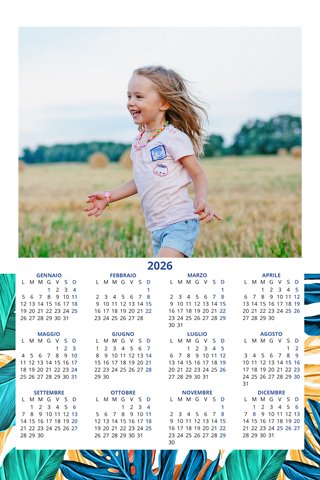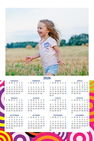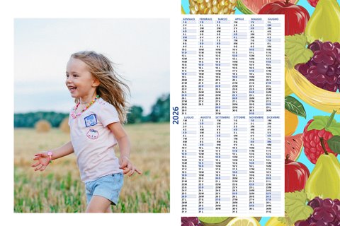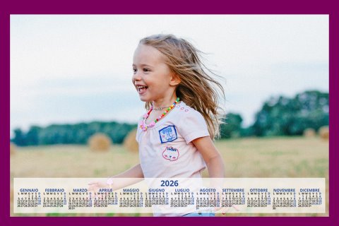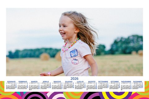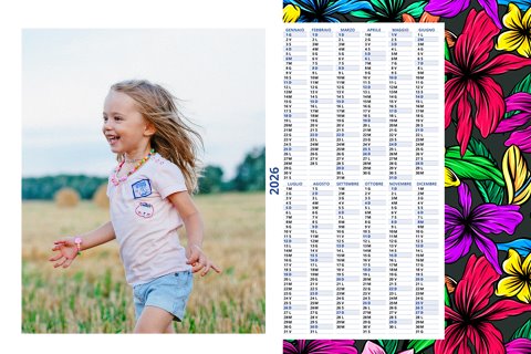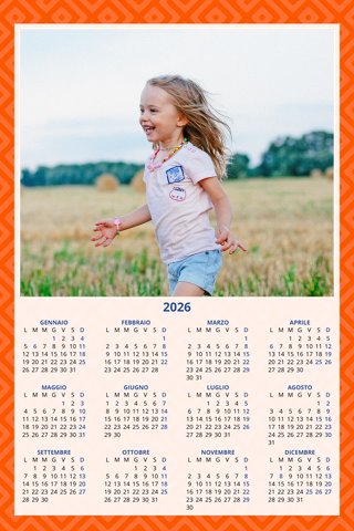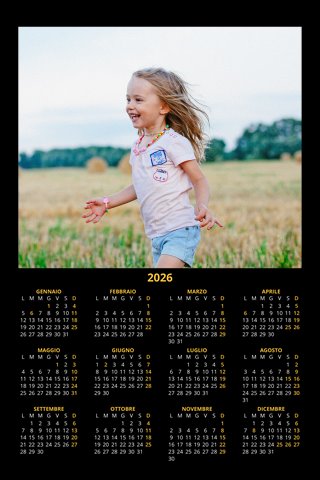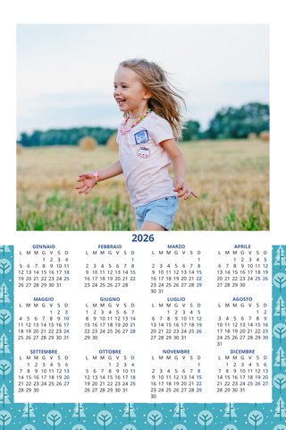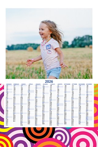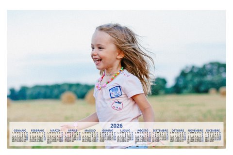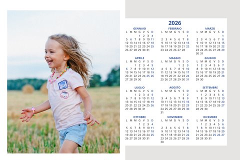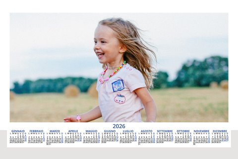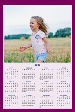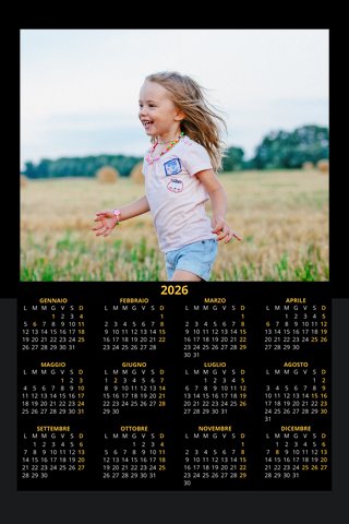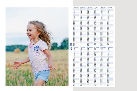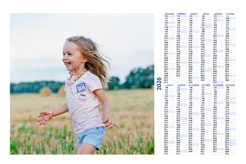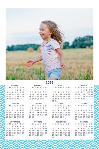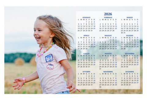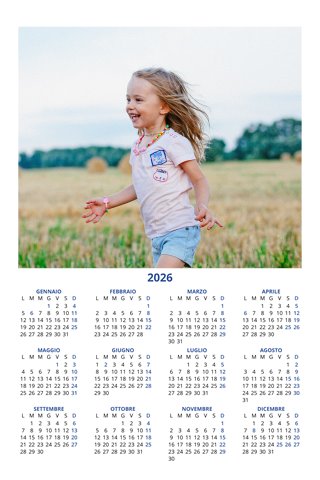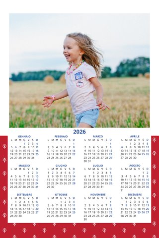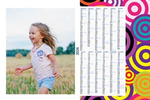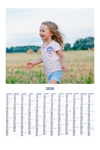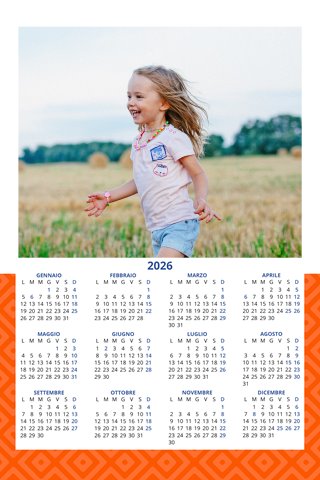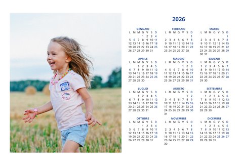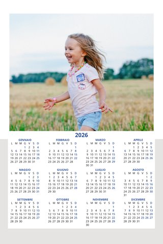 I Calendari Annuali sono offerti in differenti dimensioni e stampati su vari tipi di supporto. E’ necessaria una fotografia, da inserire in una delle raffinate grafiche offerte. Il posizionamento dell’immagine è determinante per la qualità del risultato finale: potrai modificare l’anteprima del tuo calendario, ed avere quindi il risultato più soddisfacente. E’ possibile effettuare questa operazione direttamente online.