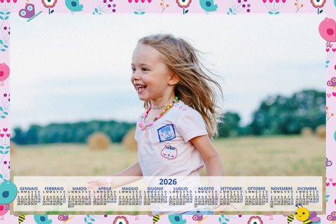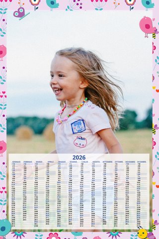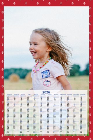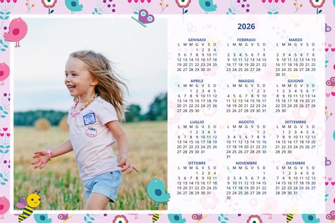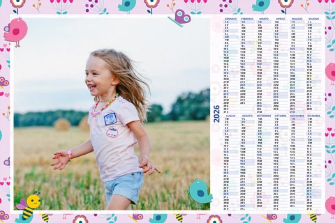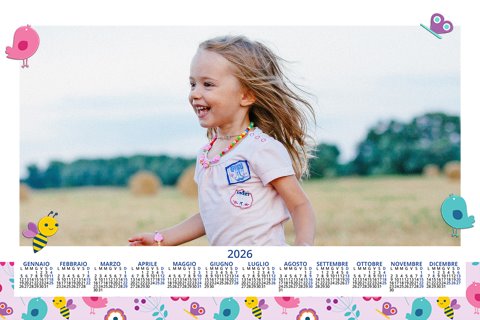 Nei calendari con grafica la foto si inserisce nella raffinata grafica a scelta (verticale e orizzontale), posizionando ogni immagine nell’area prevista all’interno di ciascun template; nei calendari senza grafica è necessario predisporre l’intera immagine completa della grafica, prestando attenzione ai margini di taglio (2%) e alla rilegatura nel lato superiore (circa 8 mm).