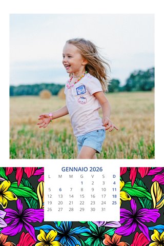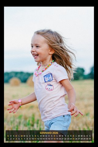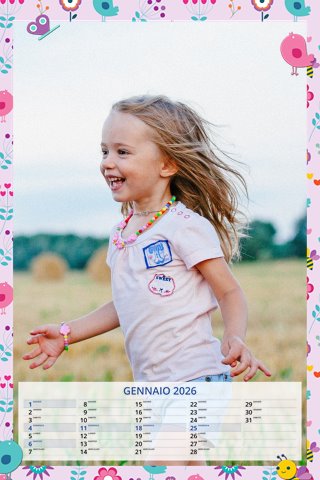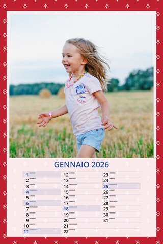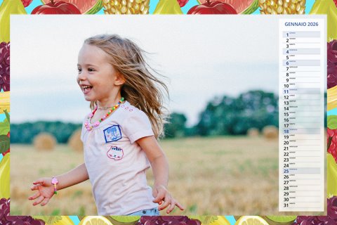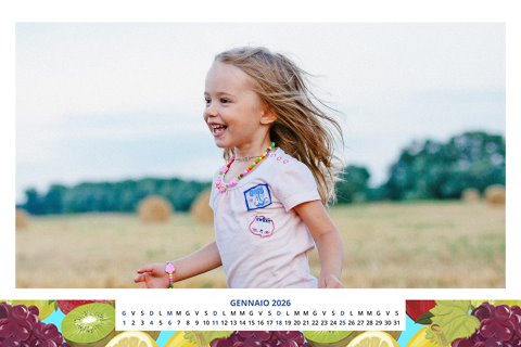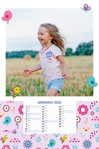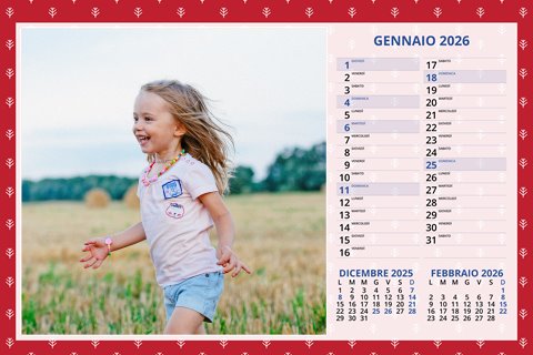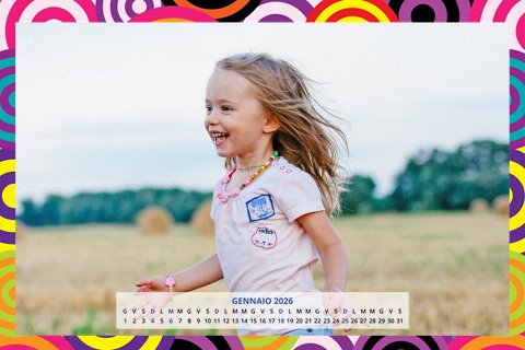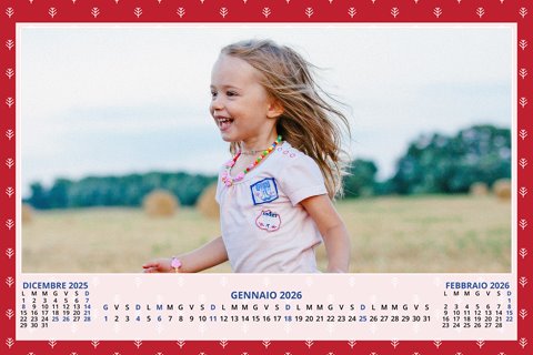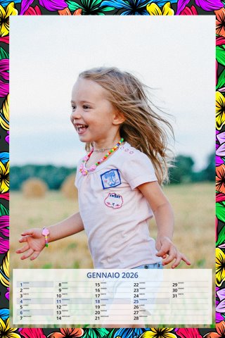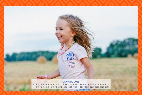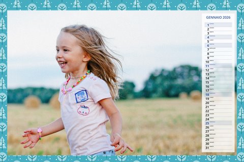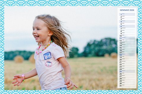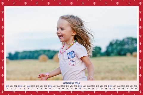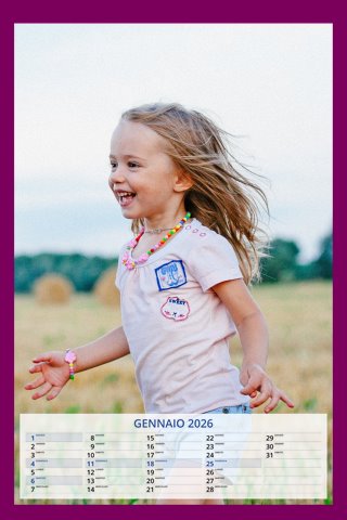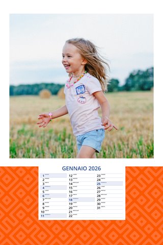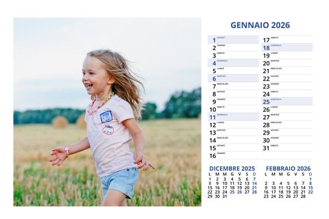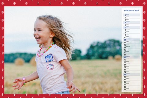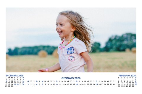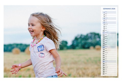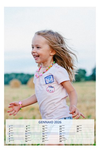 Nei calendari con grafica la foto si inserisce nella raffinata grafica a scelta (verticale e orizzontale), posizionando ogni immagine nell’area prevista all’interno di ciascun template; nei calendari senza grafica è necessario predisporre l’intera immagine completa della grafica, prestando attenzione ai margini di taglio (2%) e alla rilegatura nel lato superiore (circa 8 mm).