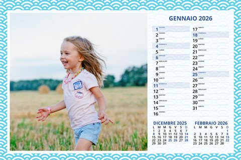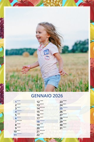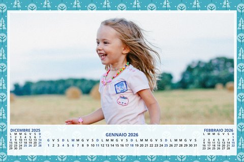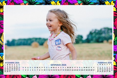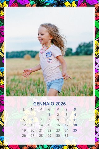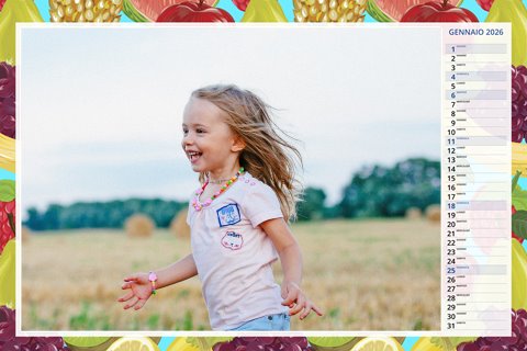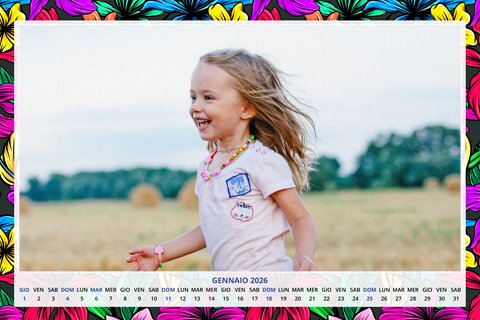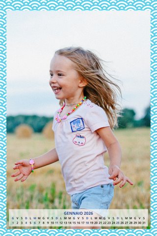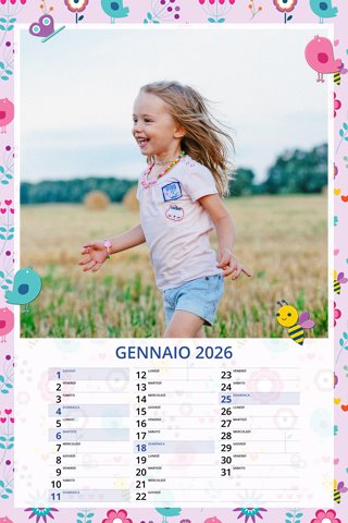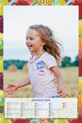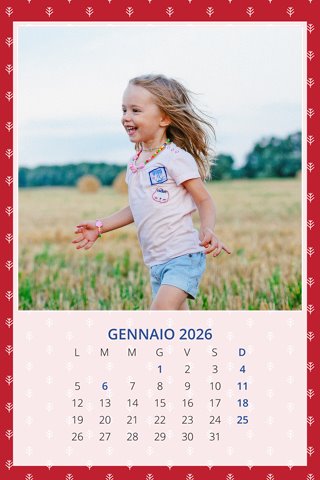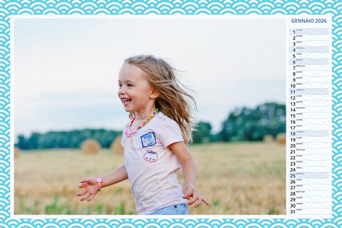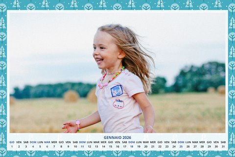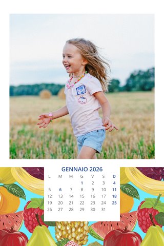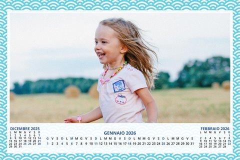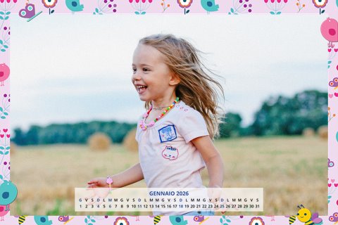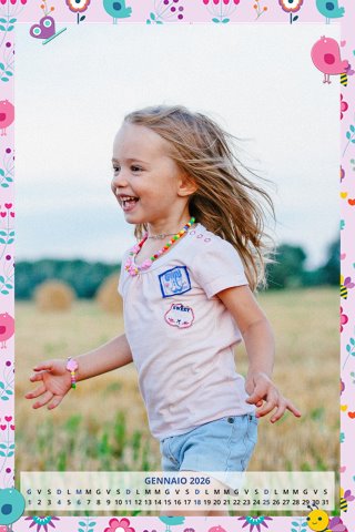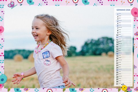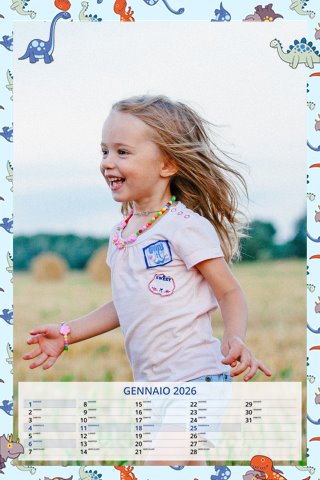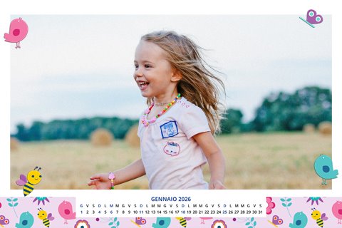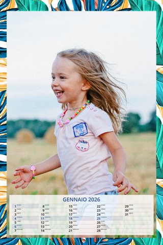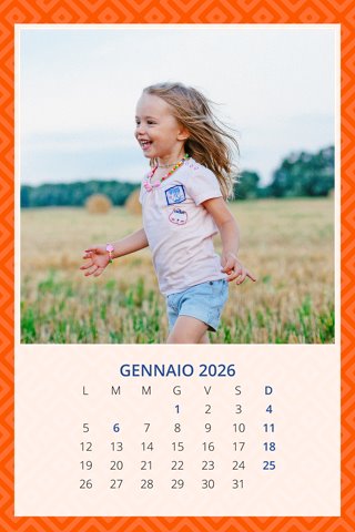 Nei calendari con grafica la foto si inserisce nella raffinata grafica a scelta (verticale e orizzontale), posizionando ogni immagine nell’area prevista all’interno di ciascun template; nei calendari senza grafica è necessario predisporre l’intera immagine completa della grafica, prestando attenzione ai margini di taglio (2%) e alla rilegatura nel lato superiore (circa 8 mm).